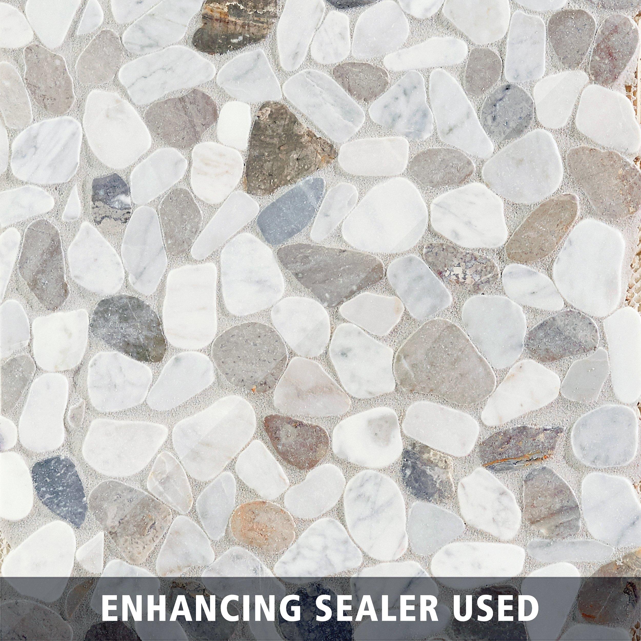 They are outstanding for entrance halls and kitchen applications. Specifically, pebble tiles are a popular choice for shower floors, where they help create a natural ambiance for the perfect relaxing bathroom retreat. Special shapes mixed light gray honed sliced pebble stone floor and wall tiles incorporate smooth, beautifully polished mixed pebbles mounted to a flexible mesh backing. Each sheet of the 12 x 12 interlocking pebble tile has approximately 60 handpicked stones bonded to a sturdy mesh backing. If your pebble tiles are round as opposed to flat, use an icing method to grout the tiles to ensure you get grout in between the uneven rocks.